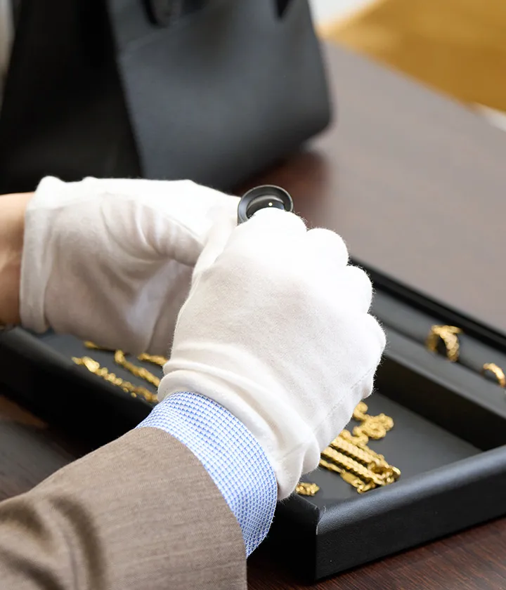 ルーペ、専門器具を使って本物偽物の見極めの方法を教わります。4Cと呼ばれるダイヤモンドのランクの評価方法や、世界相場の把握の仕方などを学びます。